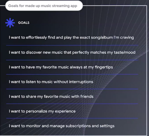 Five to seven CUJs is a reasonable number to work with, Barga-Avila suggested. These can be informed by pulling in customer support data and other existing research. He used the hypothetical example of a fictitious streaming music app, where the goals could include finding and sharing a specific song, music that reflects a user’s tastes or mood, as well as managing subscriptions and other offerings.